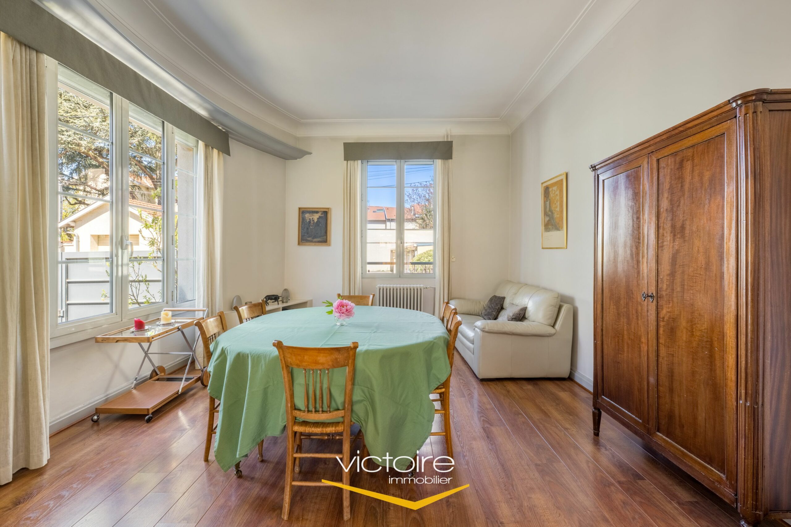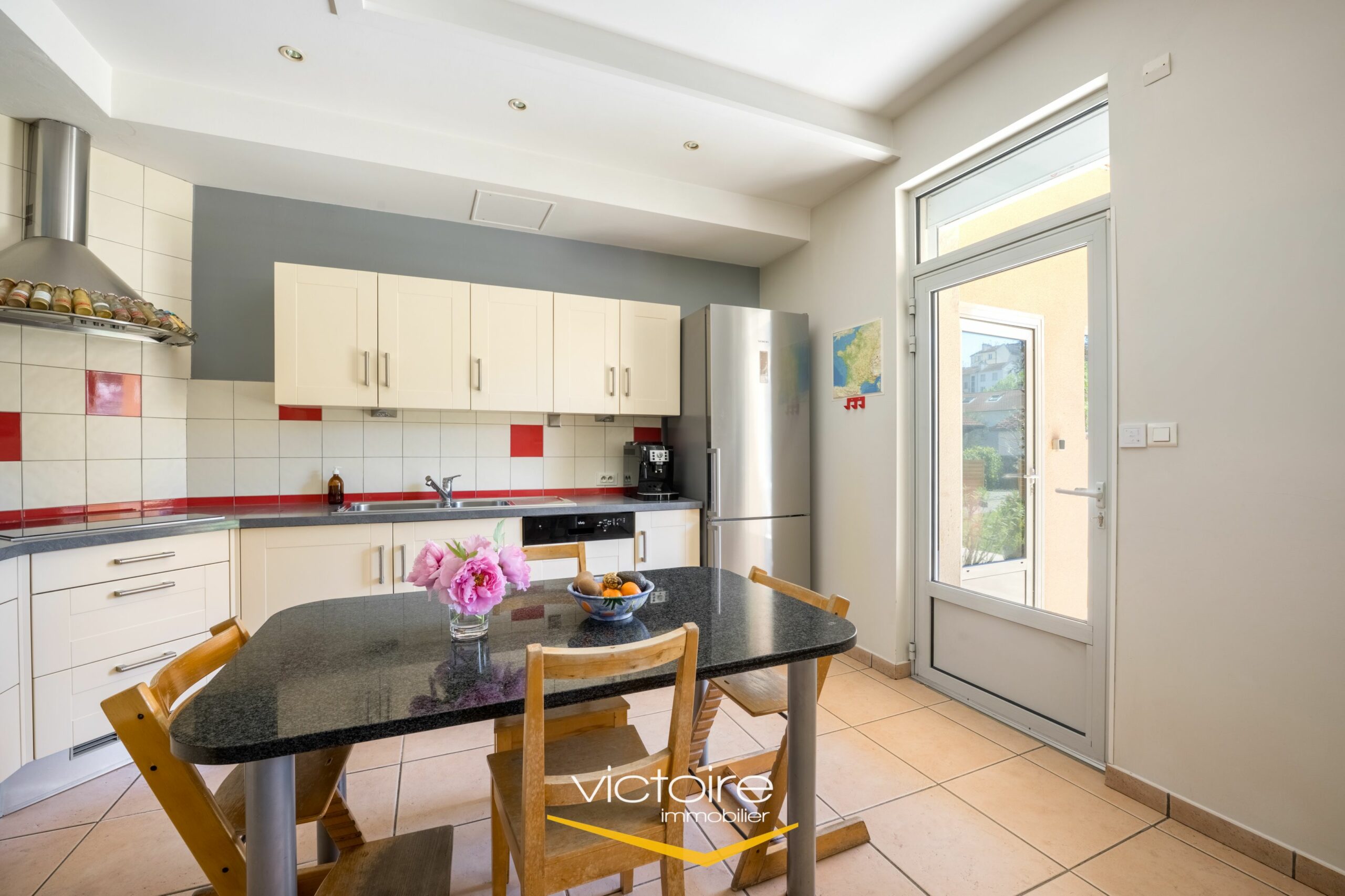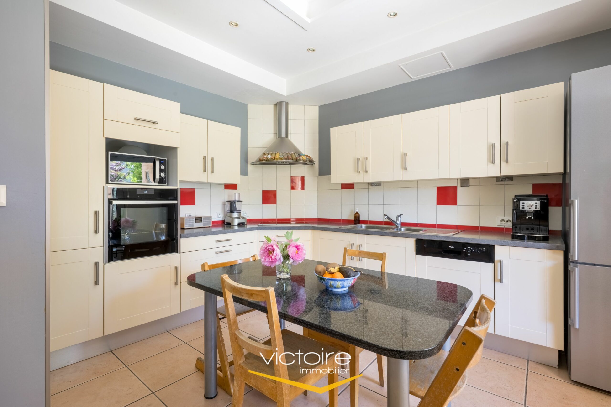 – Un espace de vie agréable et lumineux, avec une quadruple exposition; cet espace de vie de 45m² est composé d’une salle à manger et d’un coin séjour prolongé par une belle véranda donnant sur le jardin. La cuisine, voisine, est également de belle taille et c